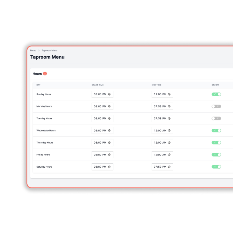 Once set, SNAPnTAP uses the hours to determine when customers can order from a catalog. Merchants, of course, may have multiple catalogs, or menus (i.e., happy hour menu), and each can be assigned its hours.